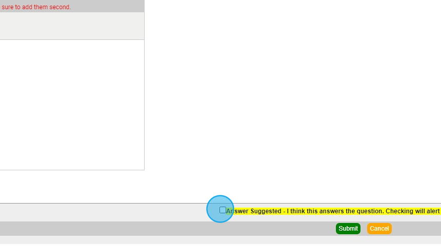 5. Click the "Answer Suggested - I think this answers the question. Checking will alert all Workflow members" field. This will highlight and suggest this answer to the Answer Administrator.