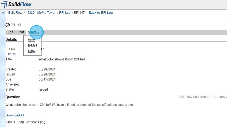 3. Click "Share " to share a direct hyperlink to the RFI.