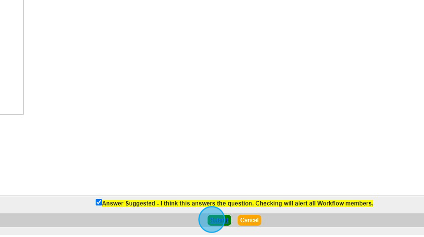 12. Click the "Answer Suggested - I think this answers the question. Checking will alert all Workflow members." field. This will highlight and suggest this answer to the Answer Administrator.
