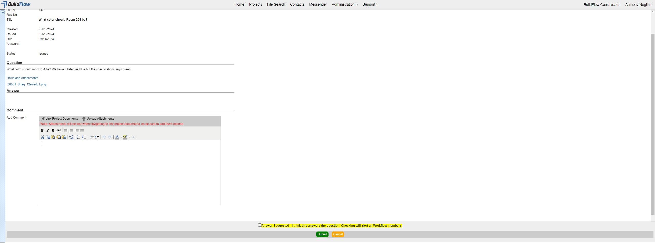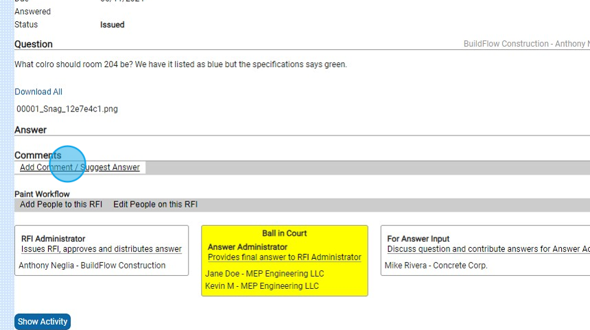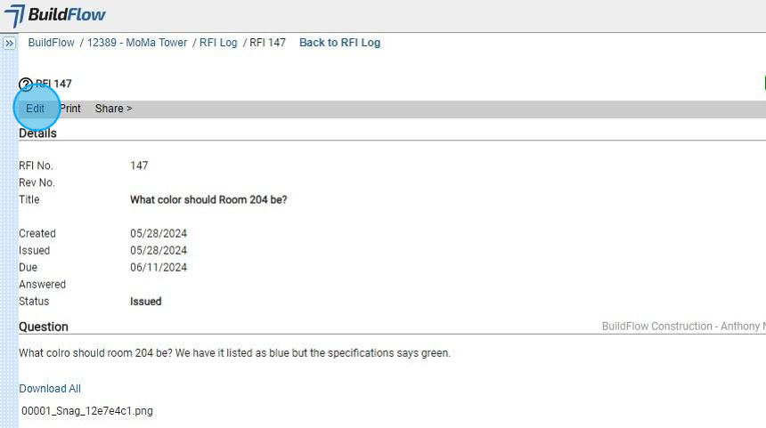 1. Click "Issue Question to Paint Workflow for Answer" to Issue the RFI to workflow and change the status to "Issued" and the Due Date will be calculated.
