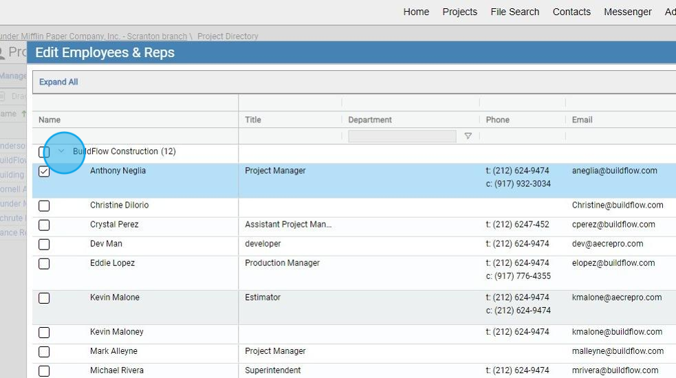 3. Click the arrow on your company to see the users you want to add to the Project Directory. You must be an Administrator to manage employees.