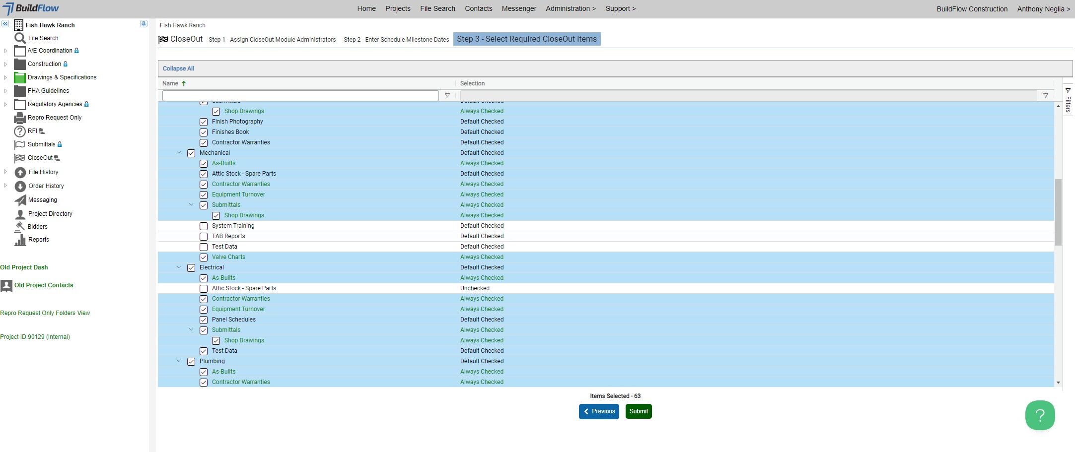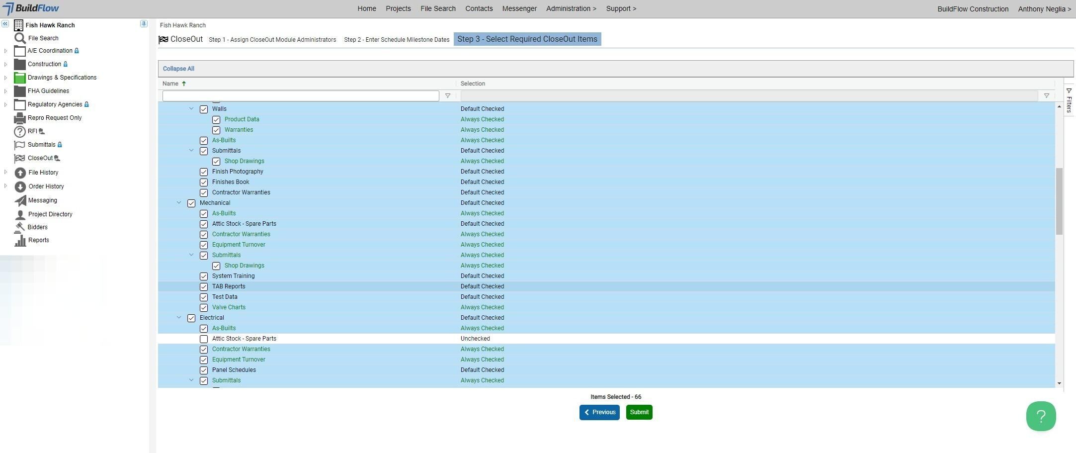 7. Choose the CloseOut Items for the project. Mandatory CloseOut Items are pre-selected and cannot be deselected. Items are initially checked if they were automatically identified in the project specifications. You also have the flexibility to add or remove CloseOut items from the Log later as needed.