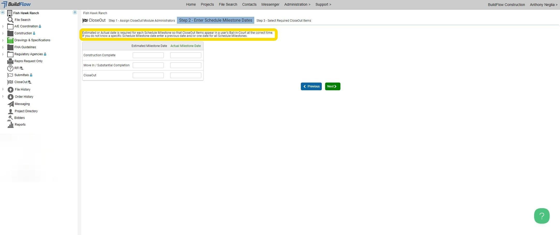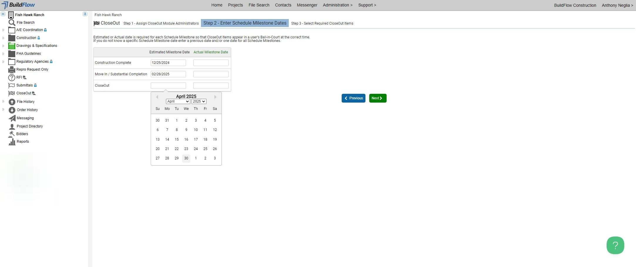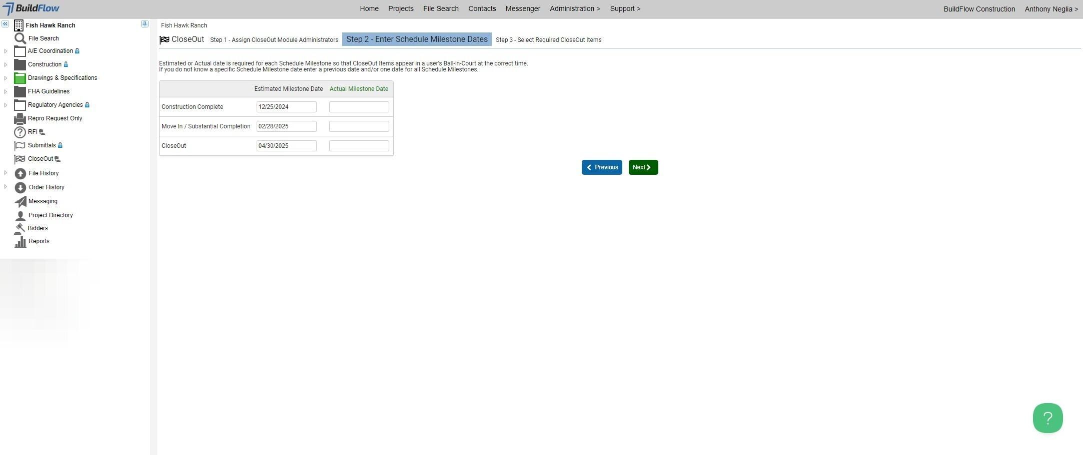 Tip! The due dates for CloseOut Items are determined by the corresponding Project Schedule Milestone. Modifying a date will result in the adjustment of all associated CloseOut Item due dates.