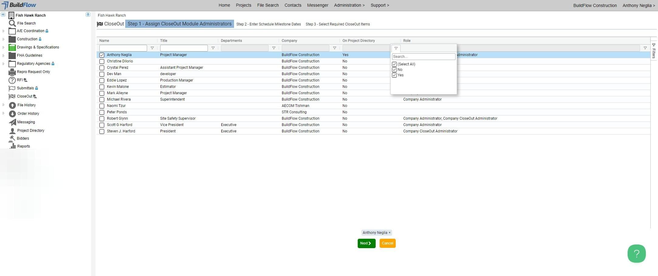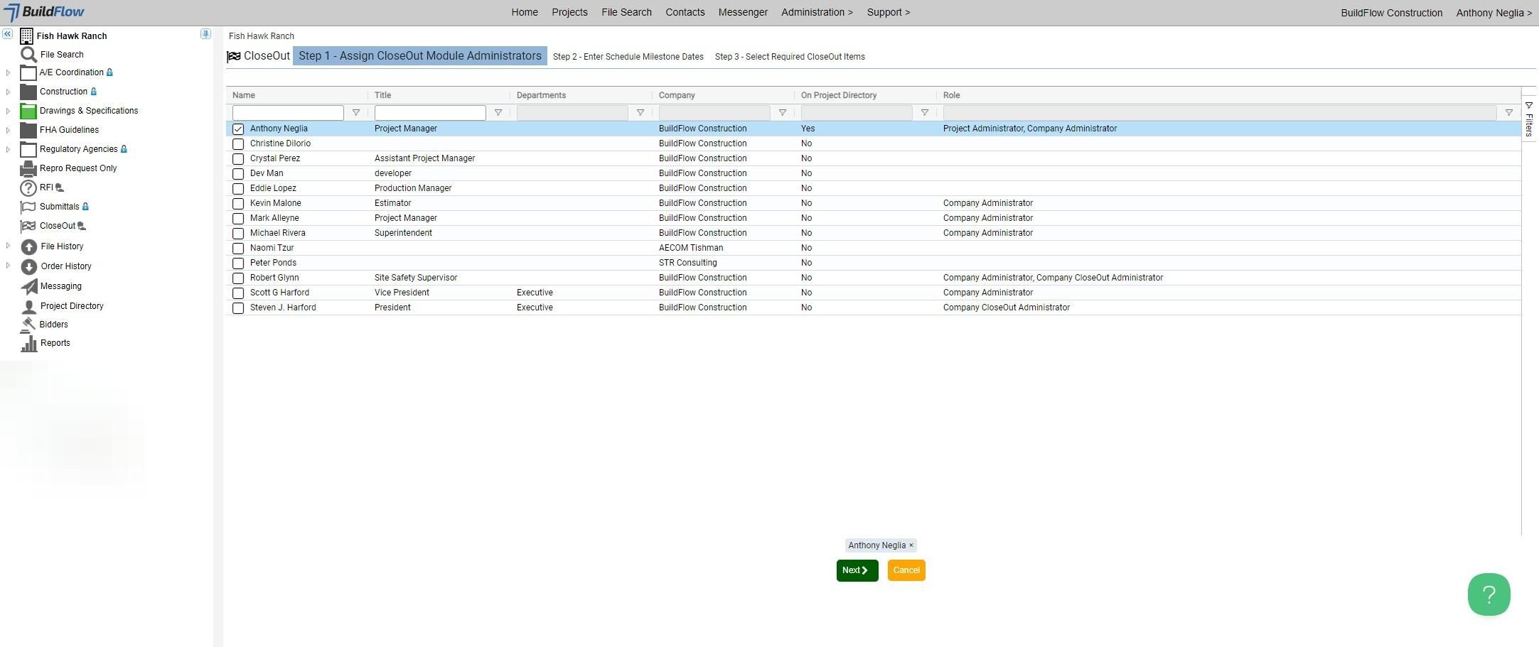 2. Project Administrators are automatically selected as CloseOut Administrators by default.