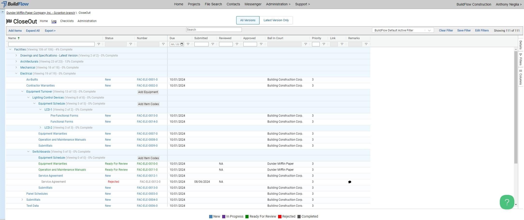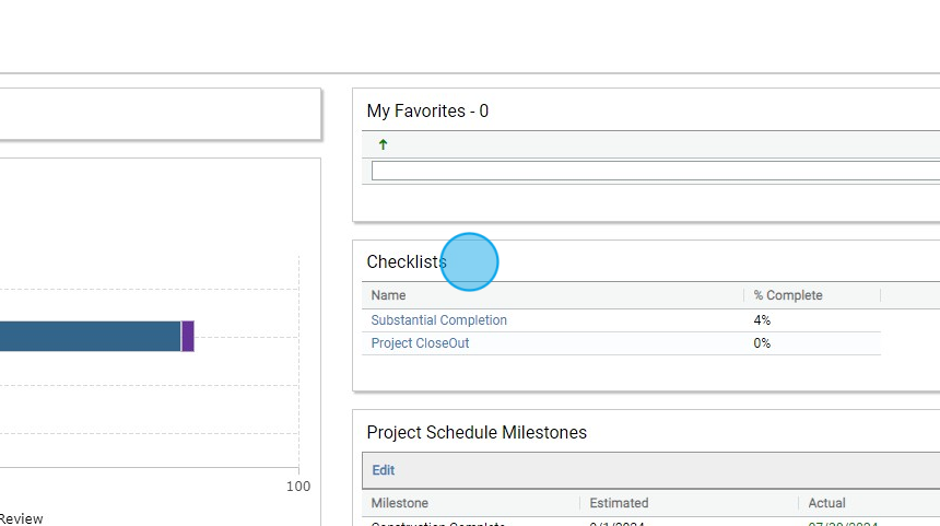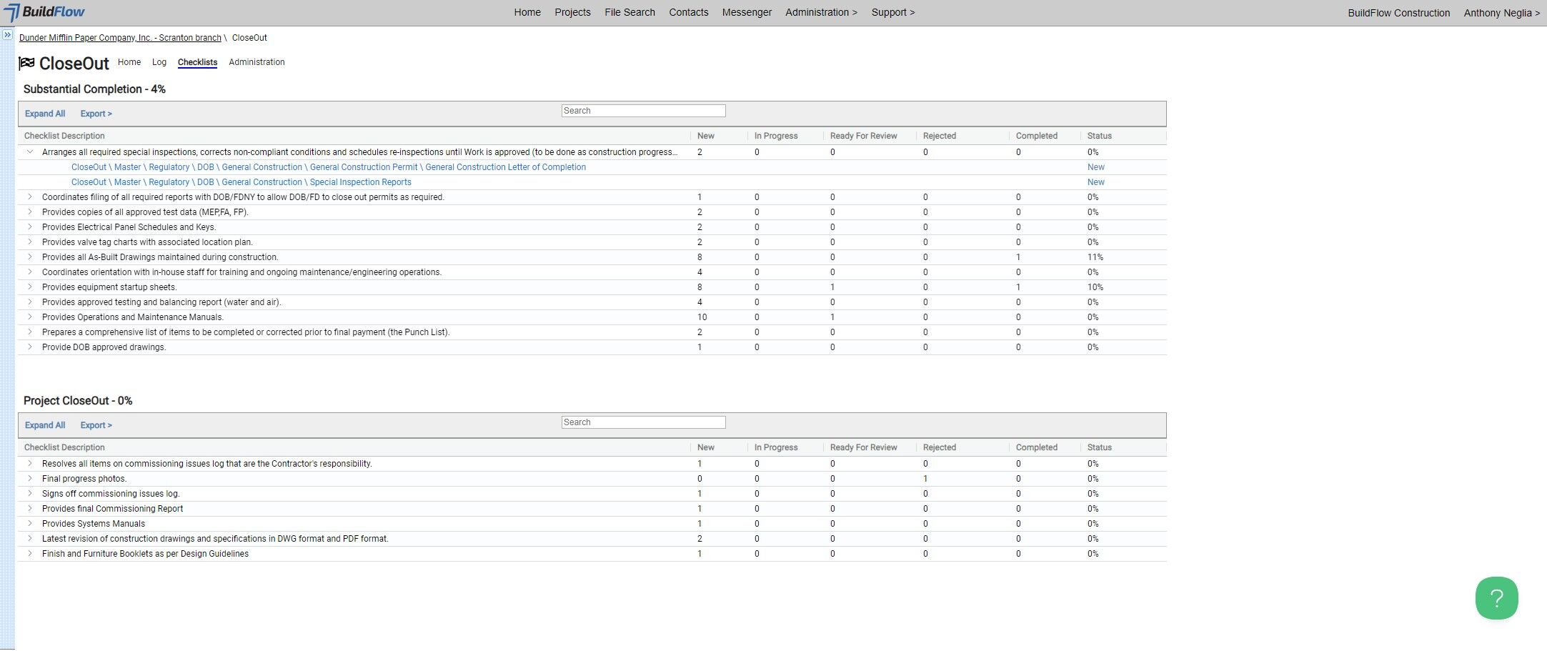 5. Checklist show the percentage complete of CloseOut items in that specific checklist.