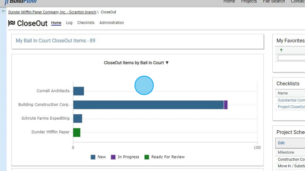 2. CloseOut Items by Ball in Court Chart provides an overview of all items and their statuses by company.