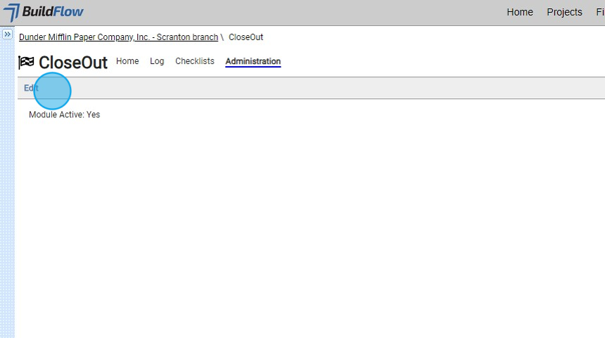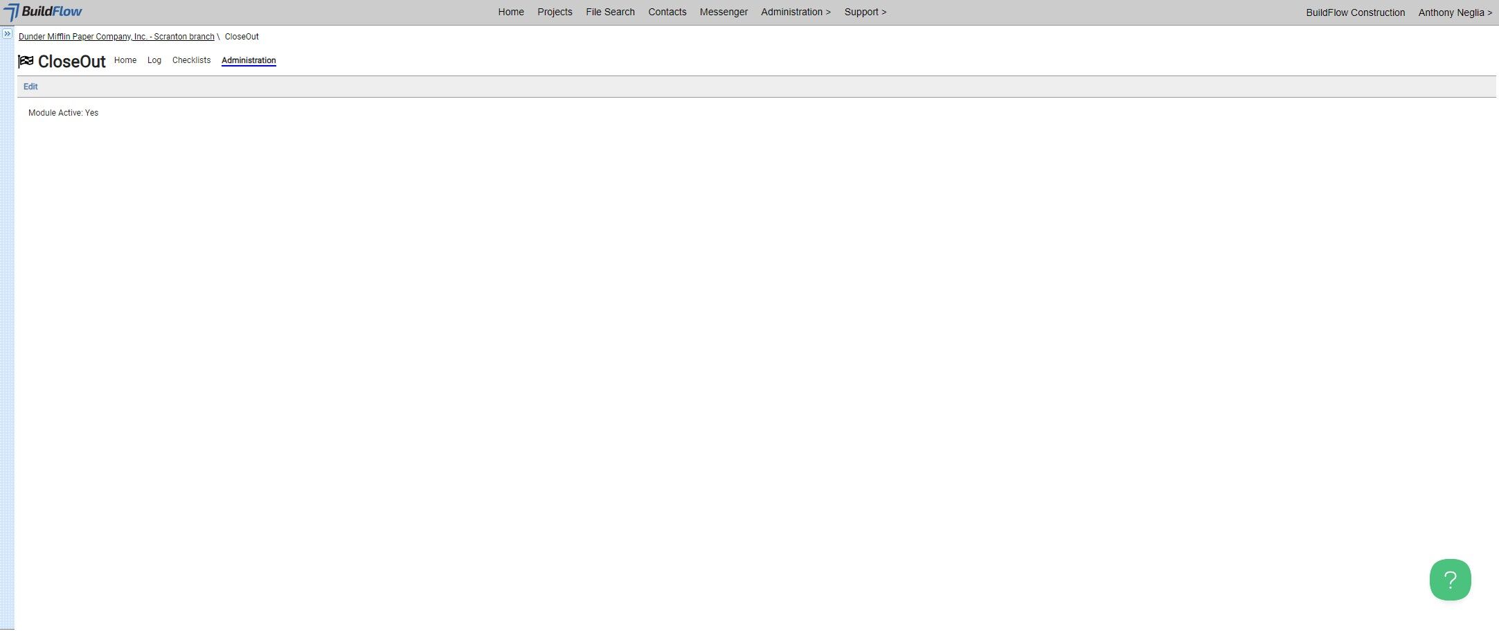 13. Click "Administration" will bring you to the Administration page.In this tab you can set your Closeout Module as Active or Inactive.