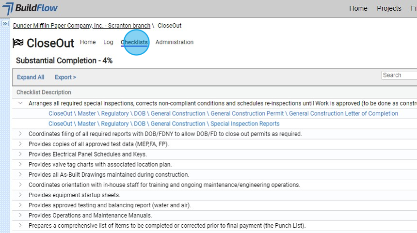 12. Click "Checklists" will bring you to your Checklists.The Checklist links your CloseOut items to a higher checklist item and give you real time progress percentages.