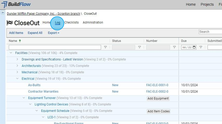11. Click "Log" will bring you to your CloseOut Log.The CloseOut Log is an interactive log which gives you all details and status of your CloseOut items.