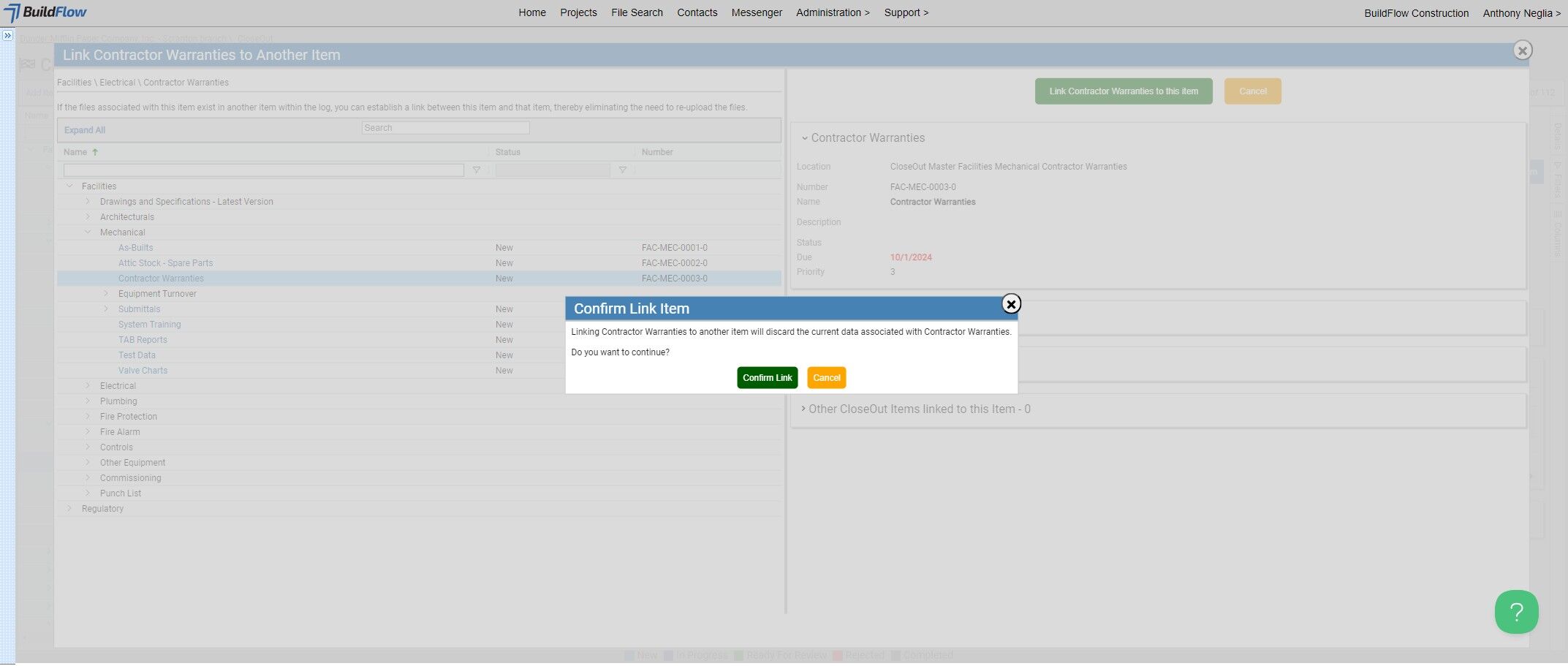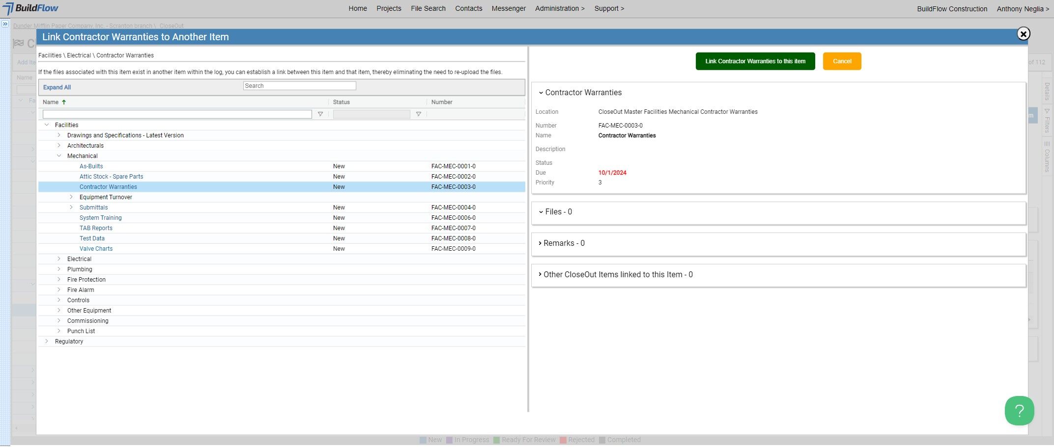 Tip! By linking CloseOut items you will only have to upload to the one item and the same file will be carried over to all other items (Example: Contractor Warranties- you can link all you General Contractor Warranties for all sub-items together to only have to upload once!)