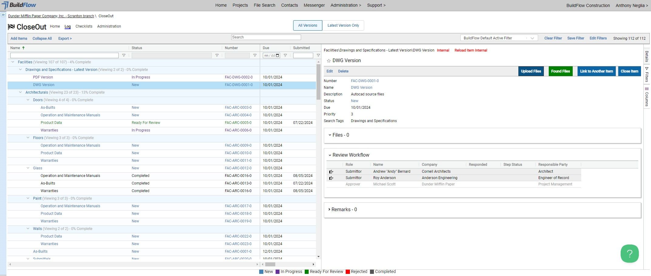 12. Click "Add to Closeout Item and Advance Workflow → Ready For Review" If you have all the files you need in this item and are ready to advance the workflow.
